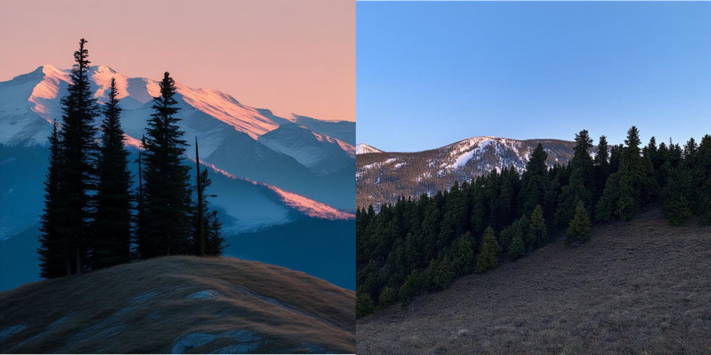 A high resolution photograph of a sloping ridge with tall pine trees at sunset. Images of snow capped mountain visible in the background.