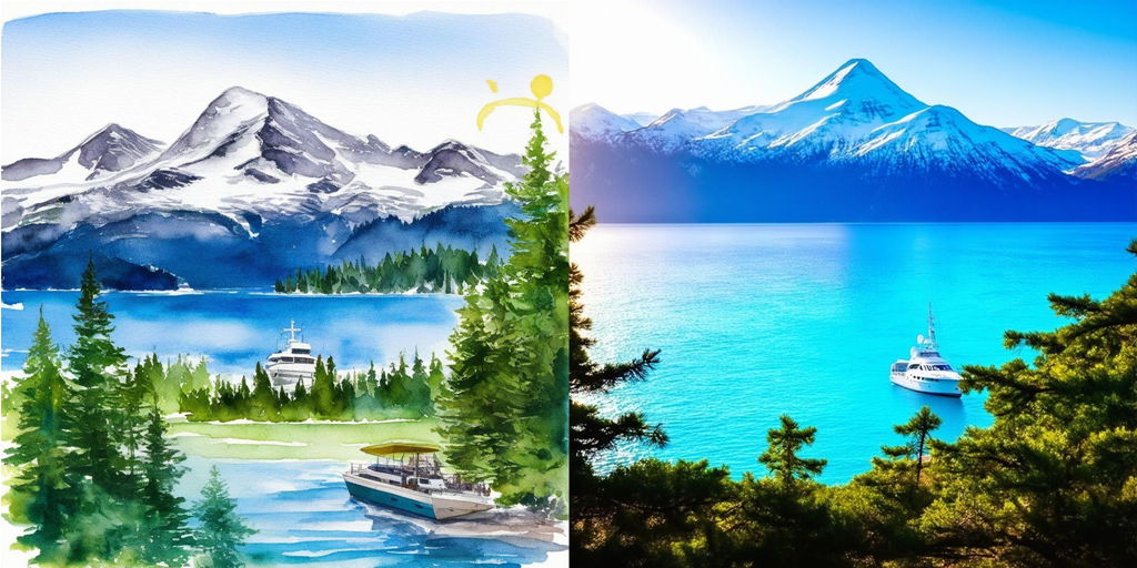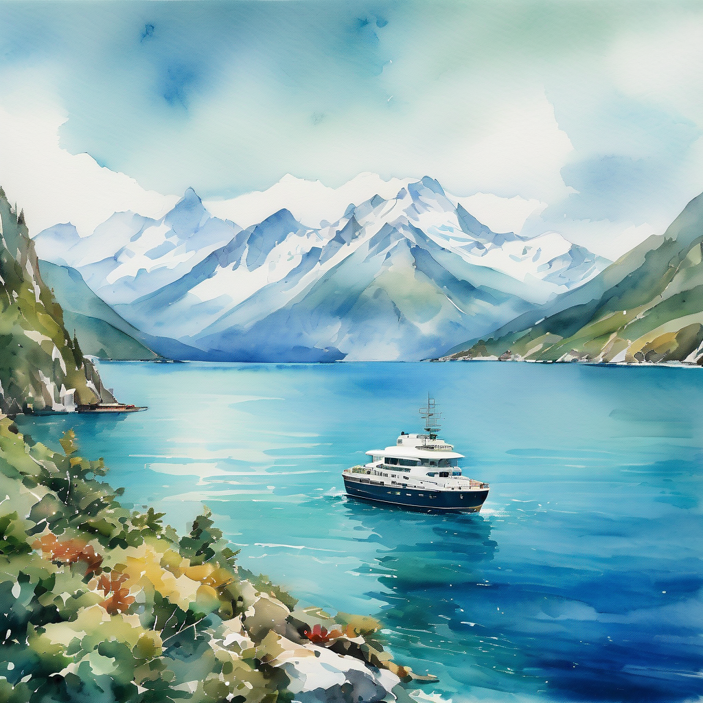 Water color style picture of snow capped mountains behind a clear blue sea with lush green forests in the foreground on right. A small yacht can be seen in the foreground. Time of day is sunrise.