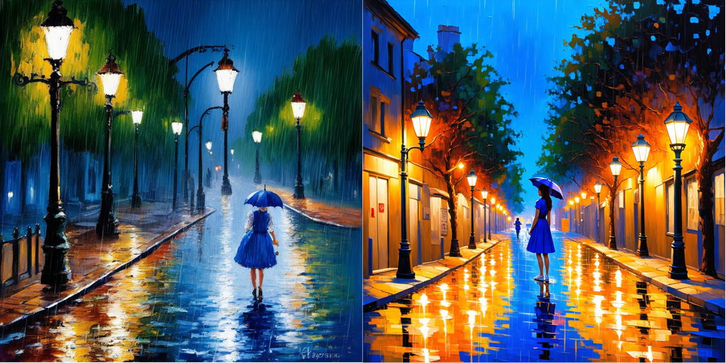 Impressionist style painting of a street illuminated by lamp posts at night. There are trees on both sides of the street. It is raining and the street is reflecting the light. A girl wearing a blue frock is seen at a distance with an umbrella.