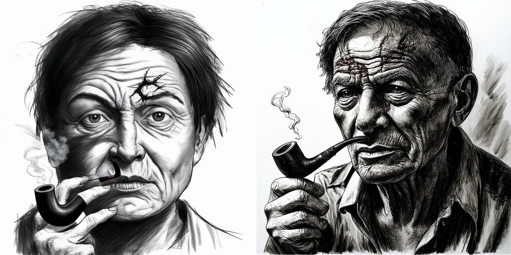 Charcoal sketch of a person’s face with a lot of wrinkles. There is a big scar on the face. The person is smoking a pipe.