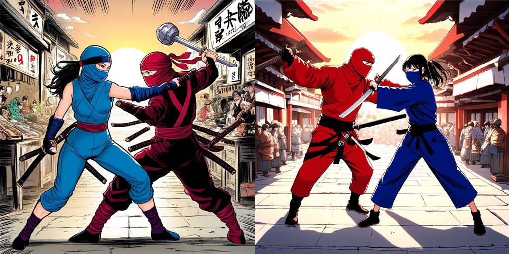 A Japanese manga type image with a female ninja dressed in blue carrying a sword fighting a male ninja dressed in red carrying a mace. They are standing in the middle of a bazaar. We can see the sun setting in the background.