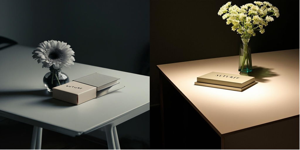 A rectangular table with a flower vase on top of it. On the side is a small rectangular box. On top of the box is a book with ‘SUTURF’ written on it. Environment lighting is moody.