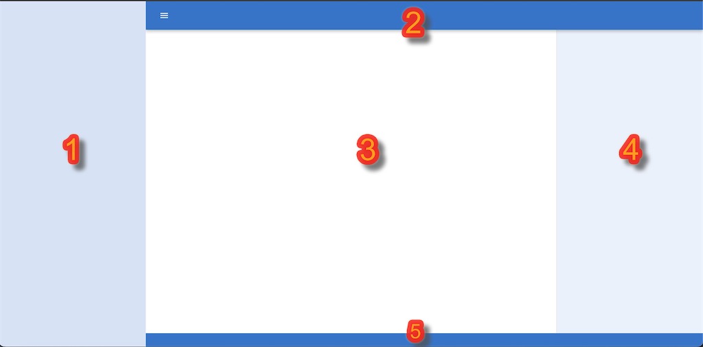 See the image above. The base block creates Section #3. #1 is the left_drawer, #2 is header. #4 is right_drawer and #5 is the footer from above code. Having got this base completed, it is just a matter of adding corresponding components in each box.