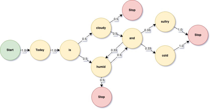 Above diagram shows the Markov Chain for the four sentences. The way it works is that we will find all next words for a specific word and distribute based on how paths are there to next words.