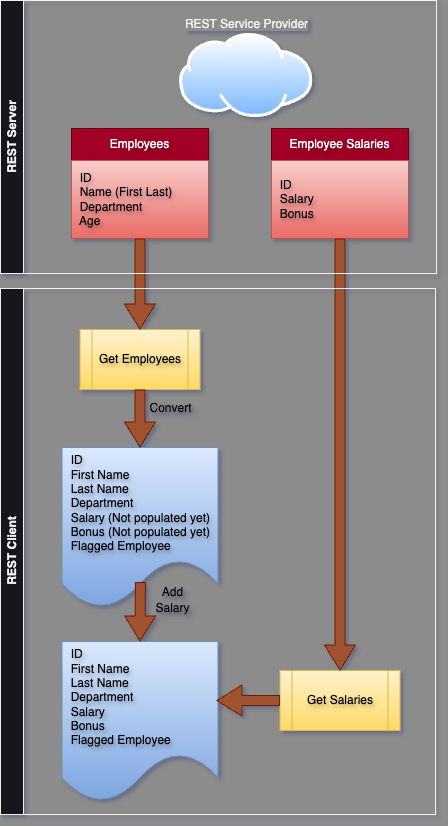We define a very simple flow. Our server is created to provide two services. On returns all the employees, and the second can be used to fetch the salaries for employees. Assume because of design flaws this did not separate out Employee Name in First and Last components. On the client side, we will merge both these data by calling corresponding service and also enrich the data by breaking employee name in first and last parts. We also have a field called flagged that will be set to true when bonus component is higher than standard bonus component. All of these are just mock scenarios :).