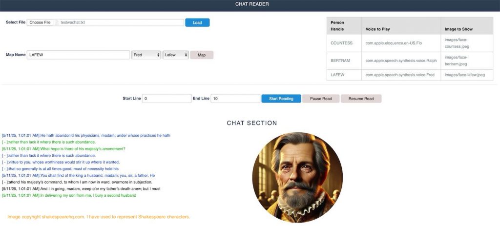 I built a very basic HTML/ CSS UI as seen on top. You have a file input control that can load a _chat.txt file in memory. A set of controls is given to map a name to corresponding voice and image. All added sets are displayed on the right hand side.